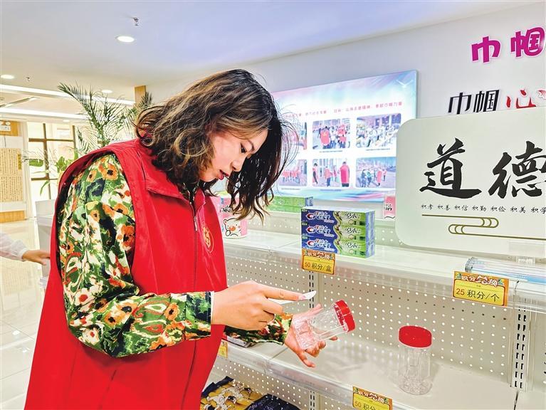 走进中川园区祥和景苑社区的“道德银行”,两侧的货架上整齐地摆放着生活日用品。这些物品的标签上标注的不是价格,而是各类志愿服务的积分。