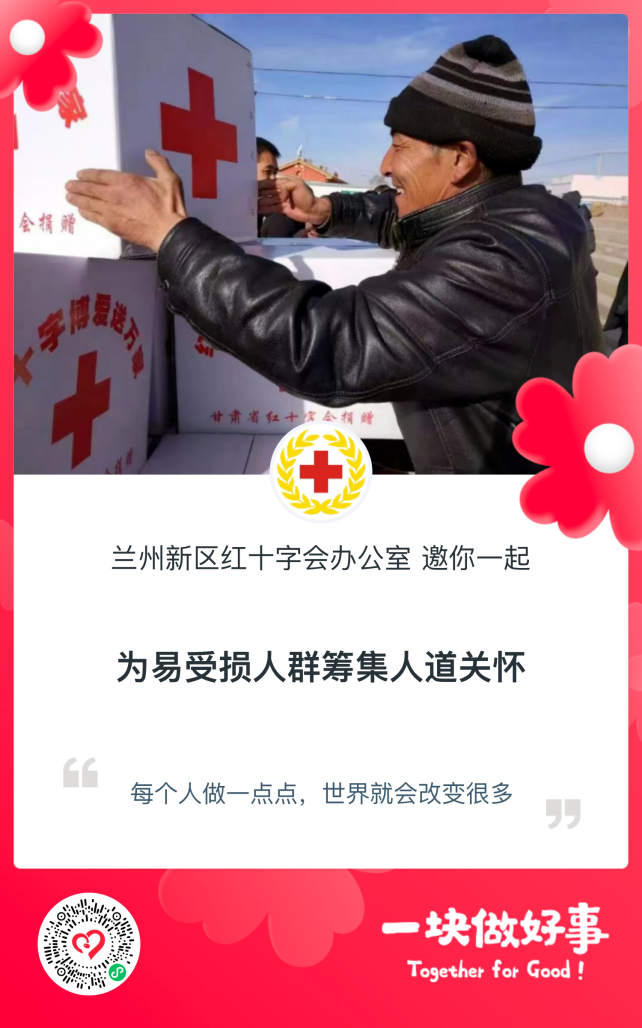 红十字不仅是一种精神,更是一面旗帜。值此第77个“世界红十字日”、第3个“5·8人道公益日”来临之际,兰州新区红十字会办公室发起“5·8人道公益日”一起捐活动。诚邀您关注“甘肃省温暖家庭箱”项目,为帮助改善新区特殊困难群体生活境况聚微光、汇大爱。