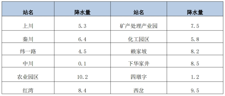 5月28日上午开始,全区普降小到中雨,截至09时,最大降水量(单位:毫米)出现在农业园区10.2mm,其次为西岔9.5、下华家井8.5、红湾8.4、赖家坡8.2、矿产处理产业园7.5、秦川6.4,其它站点在5.8mm以下。
