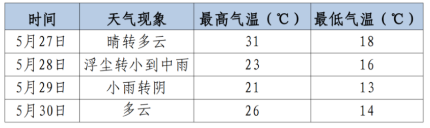 受高原槽东移和冷空气共同影响,预计28至29日,兰州新区将有一次小雨天气过程,其中28日午后至傍晚有阵雨或雷阵雨,其余时段以稳定性降水为主,主要降水时段为28日11时至23时及29日11时至16时,过程累计降水量3~15mm,伴随降水,兰州新区最高气温累计下降10~11℃,28日和29日最高气温将降至17~19℃。另外,28日凌晨及29日白天,兰州新区有5~6级偏北风并伴有弱浮尘。30日至6月2日,受西北气流或波动气流影响,全区天气以多云为主,气温回升。