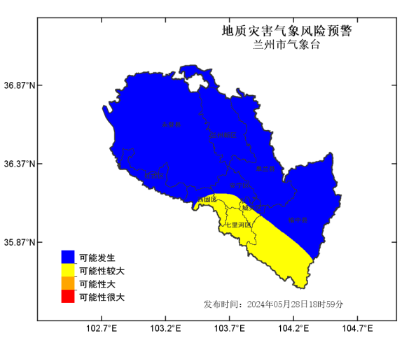 兰州市应急管理局、兰州市自然资源局与兰州市气象局5月28日19时30分发布地质灾害气象风险黄色预警:
