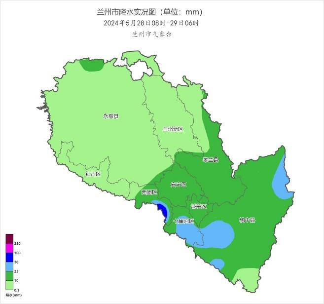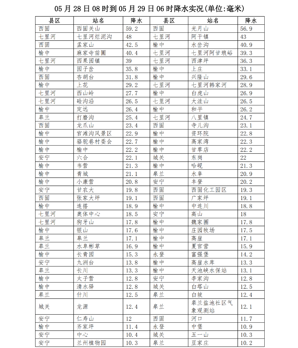 降水:5月28日上午开始,我市普降小到中雨,西固东部、七里河中南部、榆中中部及北部出现大雨,其中西固关山和西固光月山累计降雨量分别为59.2mm、56.9mm,达到暴雨。截至29日06时,其余各县区最大降水量(单位:毫米)分别为:七里河烂泥沟48、榆中水岔沟40.9、安宁六合22.1、城关东岗22、皋兰水阜20.9、永登富强堡14.2、红古河咀8.8、兰州新区农业园区8.7;另外榆中三角城22.2、皋兰三川口17.1、兰州五里铺9.1、兰州新区中川4.6、永登城关3.9。