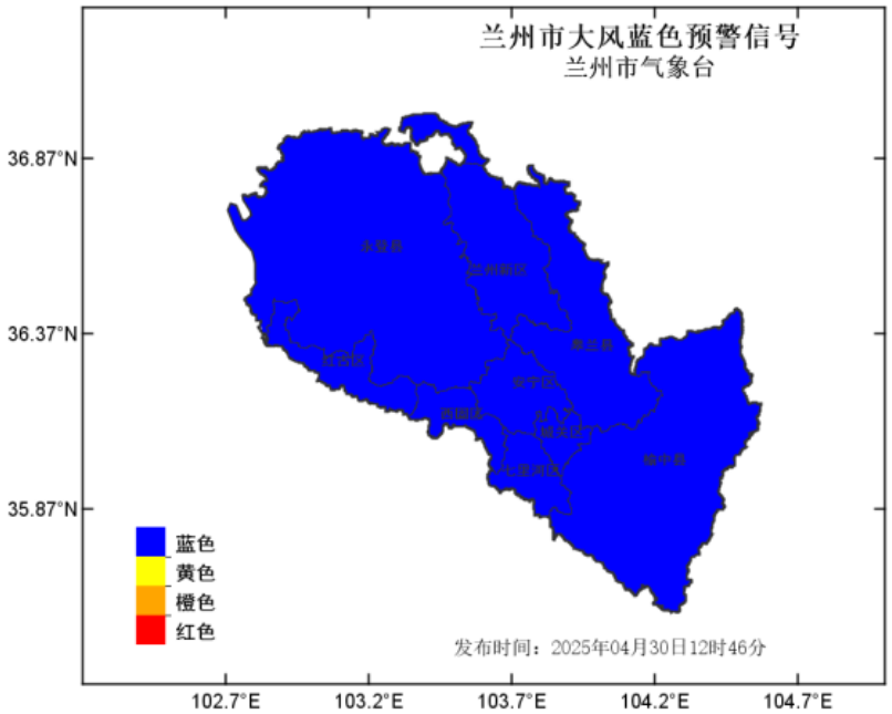 兰州市气象台2025年04月30日12时46分发布大风蓝色预警信号:预计今天午后至夜间,城关、七里河、安宁、西固及红古有4~5级偏北风;皋兰、榆中、永登及兰州新区有5~6级偏北风,阵风7级以上,并伴有浮尘。请注意防范!