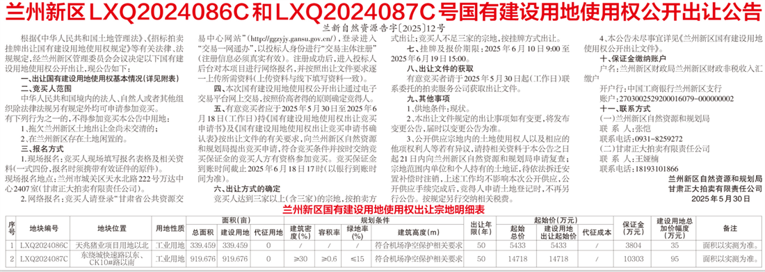 兰州新区区lxo2024086c和lxq2024087c号国有建设用地使用权公开出让公告-捕鱼网