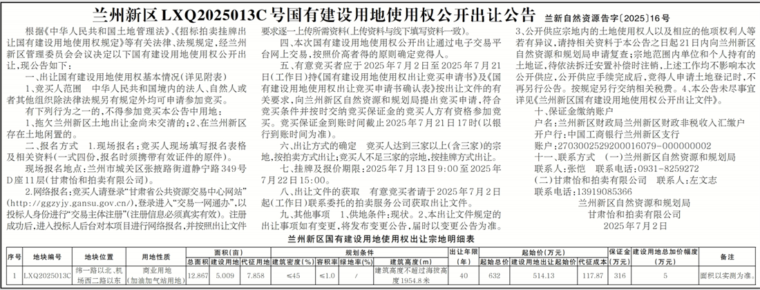 兰州新区lxq2025013c号国有建设用地使用权公开出让公告