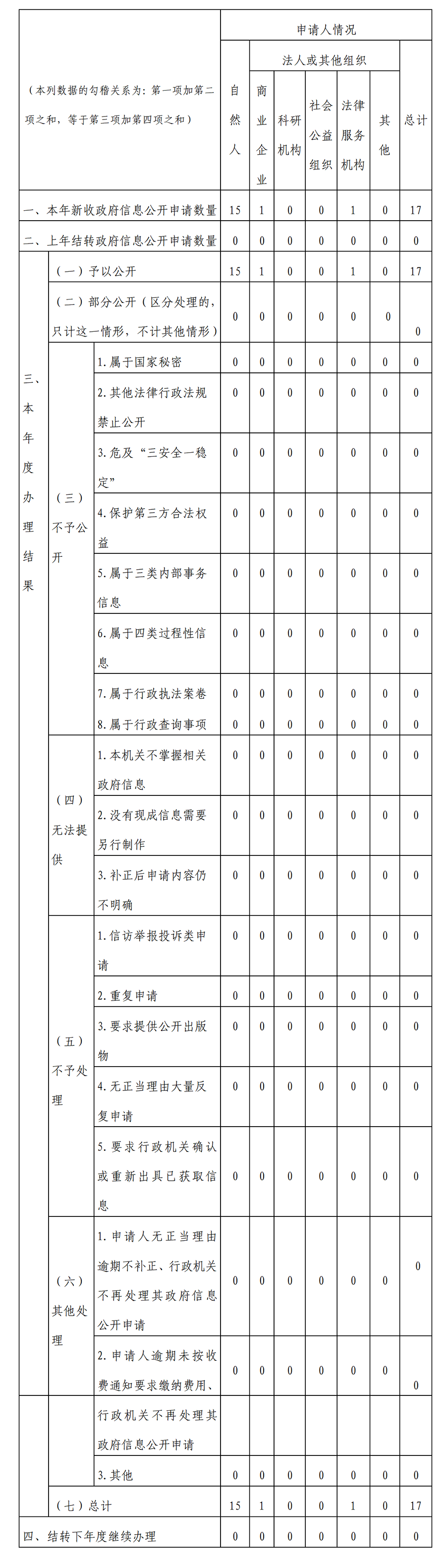 业创新的重要方法。聚焦企业和群众需求,最大限度保障公民、法人和其他组织依法、便捷获取政府信息,更好满足申请人对政府信息的个性化合理需求。2023年,全局共接收政府信息公开申请17件,办结17件。