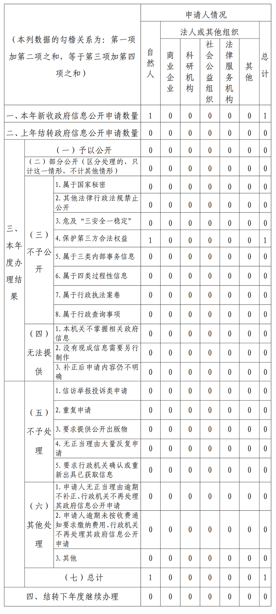根据《中华人民共和国政府信息公开条例》(以下简称《条例》),对照《兰州新区政务公开领导小组办公室关于做好2023年政府信息公开工作年度报告编制和发布工作的通知》要求,我局编制了《兰州新区农林水务局2023年政府信息公开工作年度报告》。年度报告由总体情况,主动公开政府信息情况,收到和处理政府信息公开申请情况,政府信息公开行政复议、行政诉讼情况,存在的主要问题及改进情况,其他需要报告的事项六大块组成。本报告中所列数据的统计期限自2023年1月1日起至2023年12月31日止。