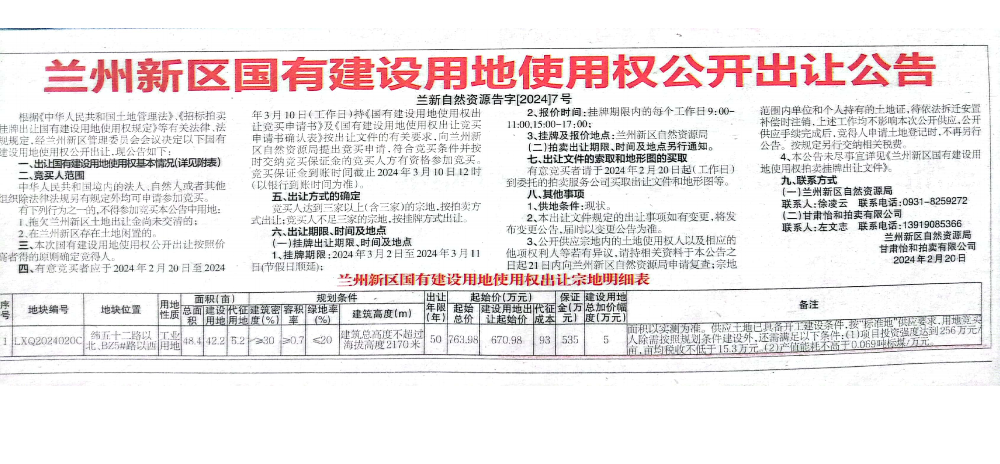 兰州新区国有建设用地使用权公开出让公告 兰新自然资源告字〔2024〕7号-捕鱼网