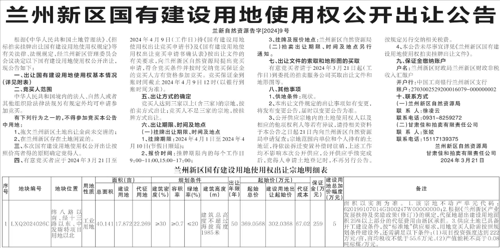 兰州新区国有建设用地使用权公开出让公告 兰新自然资源告字〔2024〕9号-捕鱼网