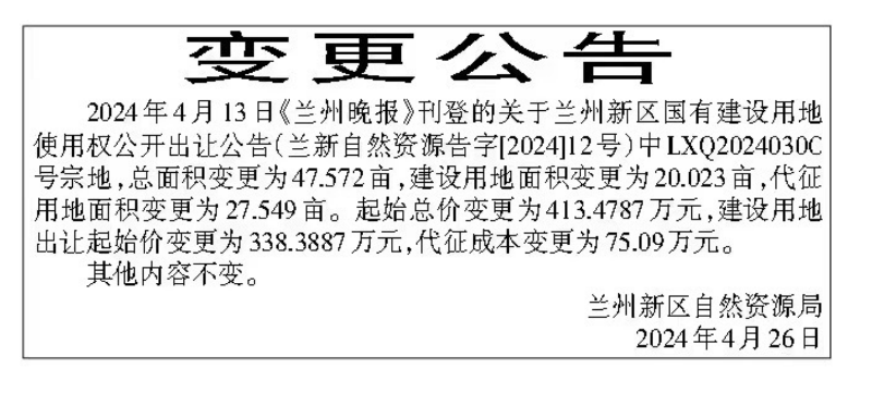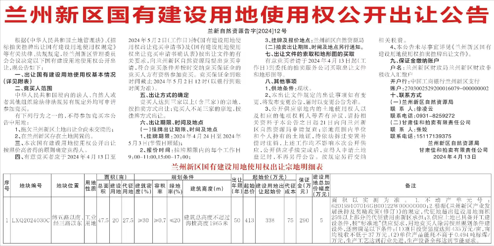 兰州新区国有建设用地使用权公开出让公告 兰新自然资源告字〔2024〕12号-捕鱼网