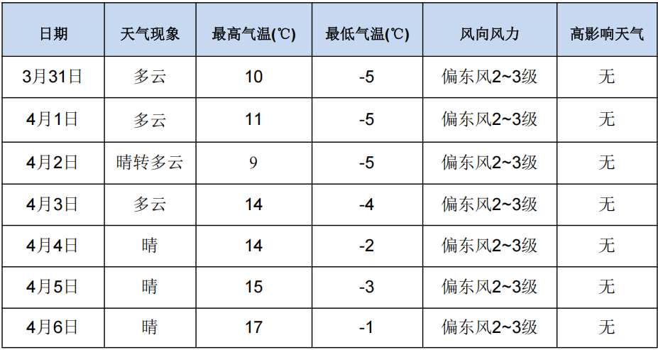 3月31日至4月1日,主要受西北气流影响,新区天气以多云为主;4月2日,受弱冷空气影响,新区最高气温小幅下降;4月3至6日,受西北气流控制,新区天气以晴为主,气温回升。