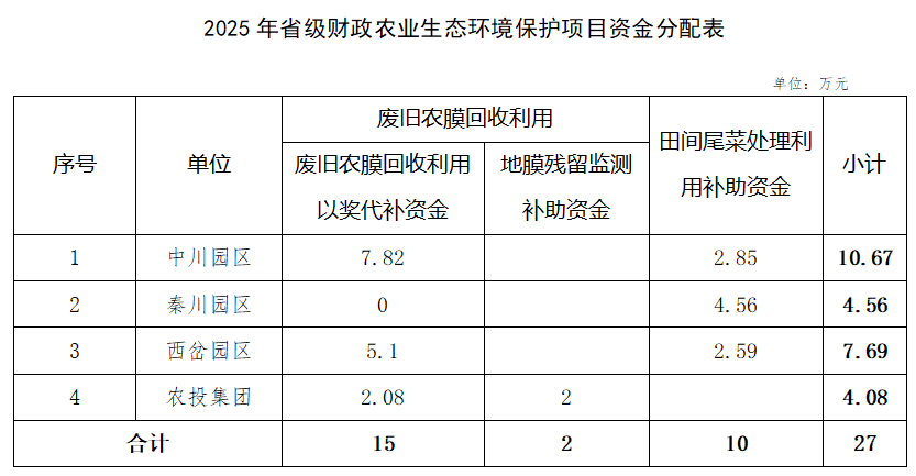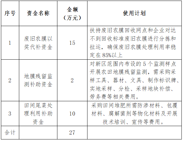 2025年省上下达新区农业生态环境保护资金27万元,其中:废旧农膜回收利用以奖代补资金15万元,地膜残留监测补助资金2万元,田间尾菜处理利用补助资金10万元。资金使用计划见下表: