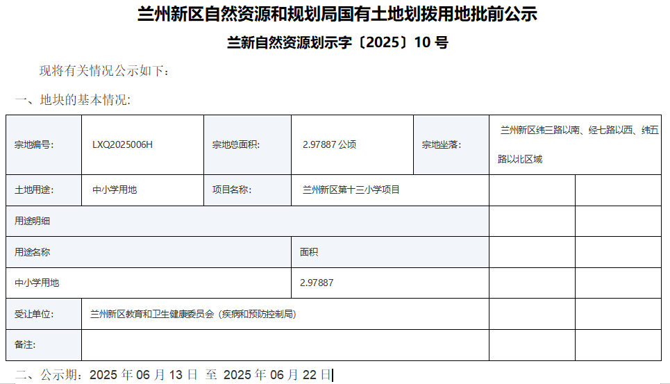 兰州新区自然资源和规划局国有土地划拨用地批前公示
