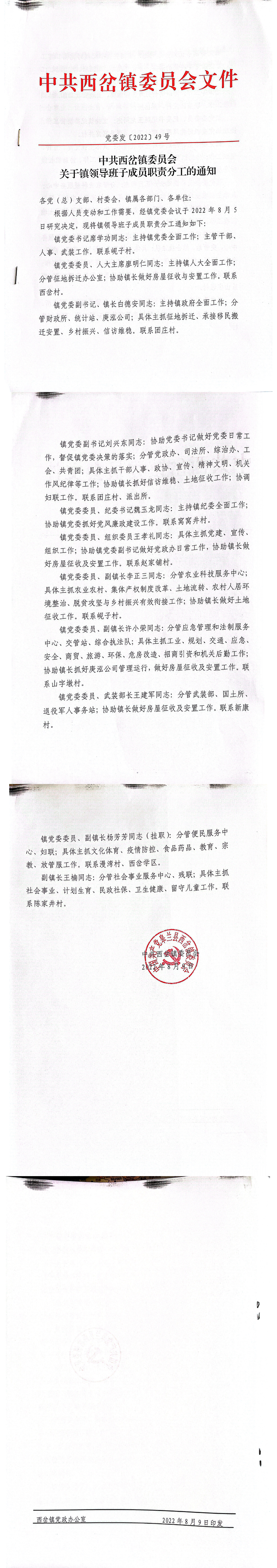 中共西岔镇委员会关于镇领导班子成员职责分工的通知-捕鱼网