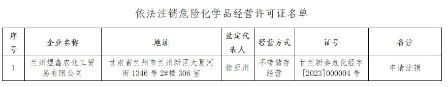 截至2024年9月24日,由于我园区兰州煜鑫农化工贸易有限公司因自身原因,申请注销《危险化学品经营许可证》(具体信息见附件),依据《中华人民共和国行政许可法》第七十条第(一)项、《危险化学品经营许可证管理办法》(原国家安全监管总局令第55号)第二十七条第一款第(二)项之规定,决定对该企业《危险化学品经营许可证》依法予以注销。