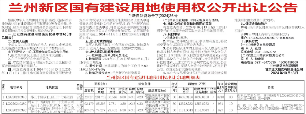 兰州新区国有建设用地使用权公开出让公告 兰新自然资源告字〔2024〕36号