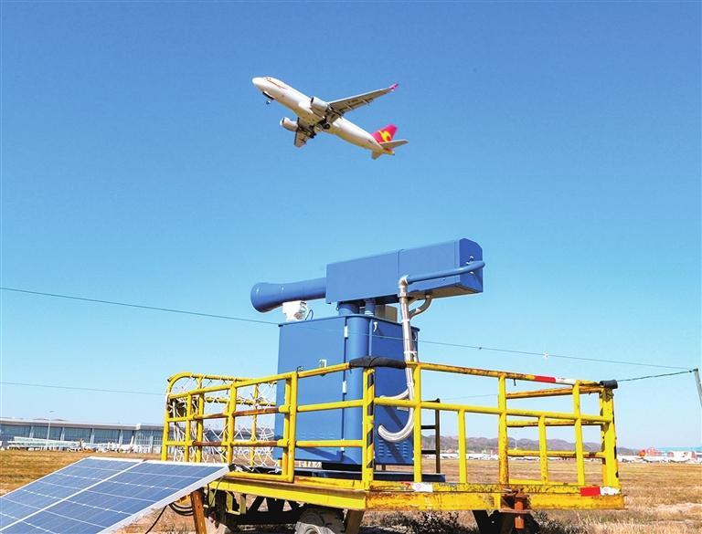原来,驱鸟员正拿着高空驱鸟器对飞行区过夜的鸟儿进行驱赶,为当日首班机清除鸟击隐患,这是记者日前在兰州中川国际机场飞行区看到的一幕。