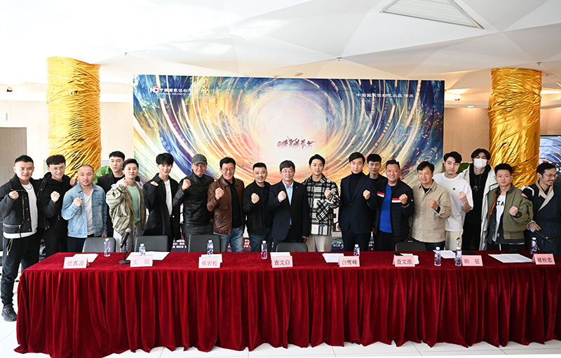2022年4月7日,根据小说《最后的电波》改编,由中国国家话剧院出品、演出的新创话剧《铁流东进》主创人员在发布会现场合影。新华社记者 金良快 摄