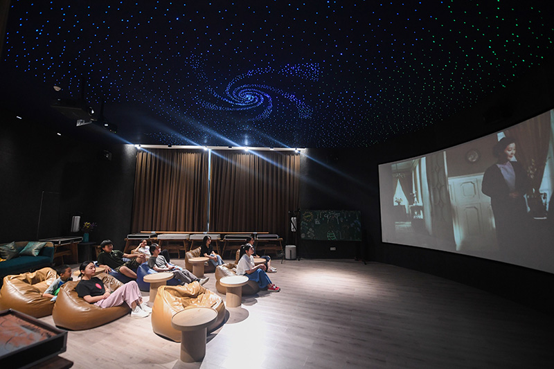 2022年7月2日,居民在位于浙江省杭州市富阳区银湖街道硅谷社区的“合之舍”书房的影视厅内观看电影。该书房是银湖街道“15分钟品质文化生活圈”的重要示范点位。新华社记者 徐昱 摄