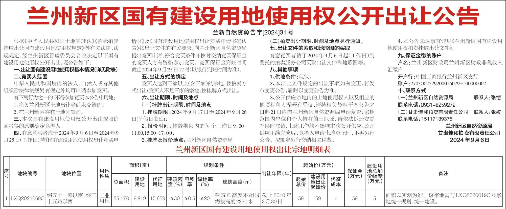 兰州新区国有建设用地使用权公开出让公告 兰新自然资源告字〔2024〕31号-捕鱼网