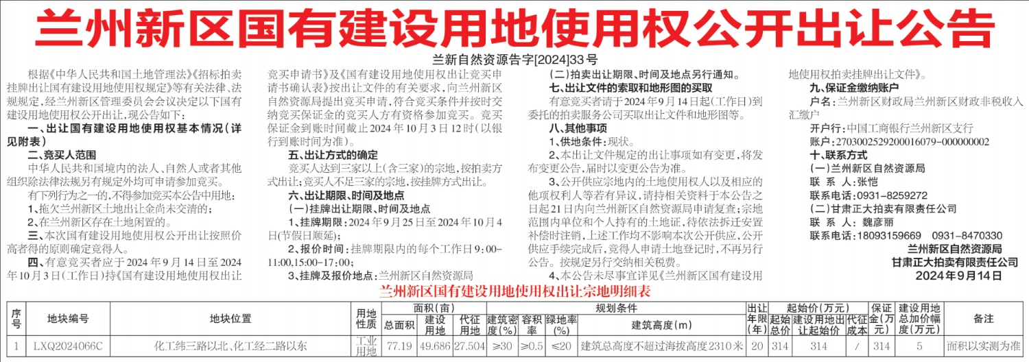 兰州新区国有建设用地使用权公开出让公告 兰新自然资源告字〔2024〕33号-捕鱼网