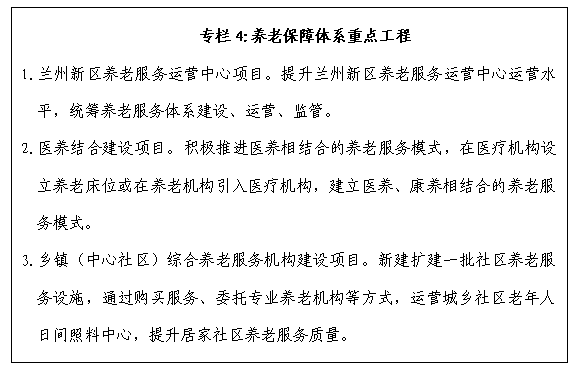 ——养老服务事业发展成效显著。投入本级财政资金并争取福利彩票公益金5000余万元建成兰州新区综合性社会福利院,实施了秦川福寿院消防安全达标工程,机构养老步入新局面。建成兰州新区养老服务运营中心,购买社会力量实施具体运营,采集1.98万名老人基础信息,养老服务设施覆盖所有城市社区、60%以上的村,居家和社区养老工作基础进一步夯实。打通新区养老机构与卫健医疗系统“绿色通道”,开辟了医养结合新路径。实施社会福利院适老化改造和康复辅具适配项目,护理型床位占比达到35%。全面落实经济困难老年人补贴制度,建立农村留守老人定期巡访制度,农村留守老人关爱服务体系进一步健全。