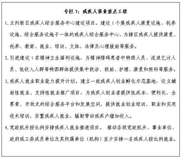 强化残疾预防。保障残疾人基本康复服务需求,加强辅助器具推广和适配服务,巩固国家康复辅助器具产业综合创新试点和康复辅助器具社区租赁服务试点成果,推广试点经验。完善残疾人权益保障机制,加快无障碍环境建设。全面推进公共场所、交通出行、社区居家、信息网络等无障碍环境建设,将兰州新区建设成西部地区无障碍建设示范城市。健全残疾预防工作体系,完善残疾预防政策与措施。扎实开展残疾预防知识普及教育,减少药物致残,控制、减少环境因素和意外事故致残。健全精神残疾预防、工伤致残预防、职业病防治监管体系。认真组织“全国助残日”、“国际残疾人日”等活动,大力宣传自强模范、扶残助残先进集体和个人等典型事迹。