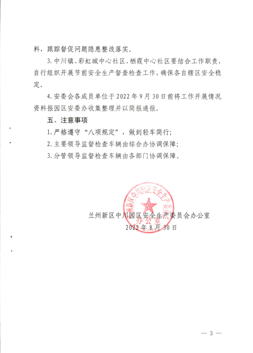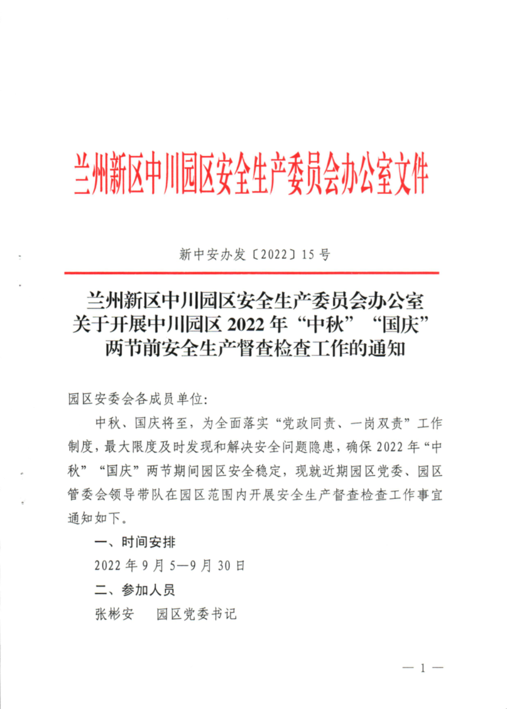 兰州新区中川园区安全生产委员会办公室 关于开展中川园区2022年“中秋”“国庆” 两节前安全生产督查检查工作的通知-捕鱼网