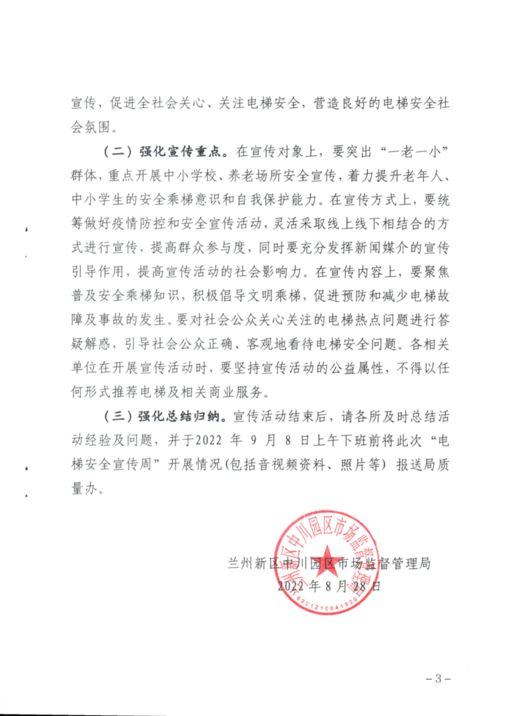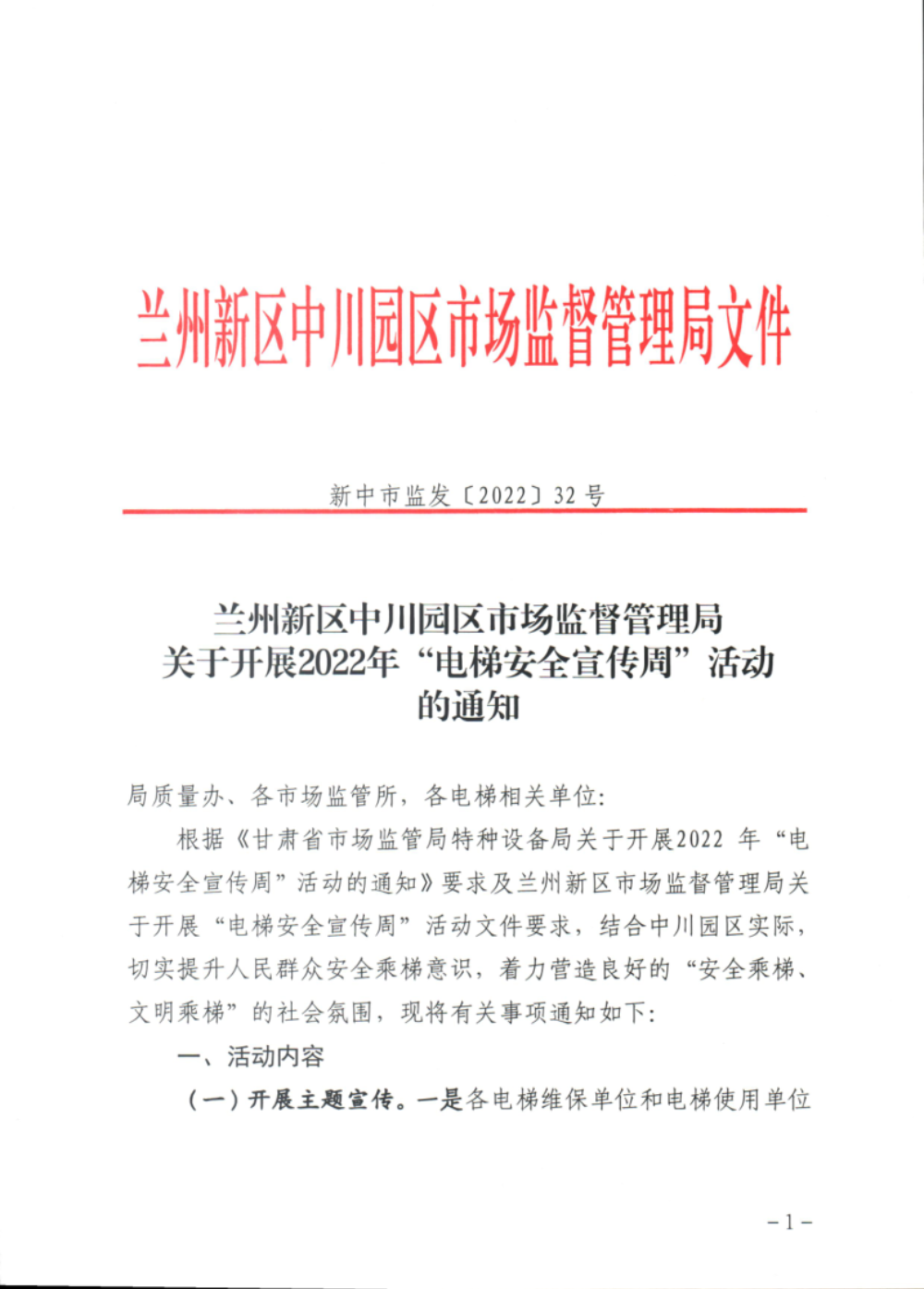 兰州新区中川园区市场监督管理局 关于开展2022年“电梯安全宣传周”活动的通知-捕鱼网