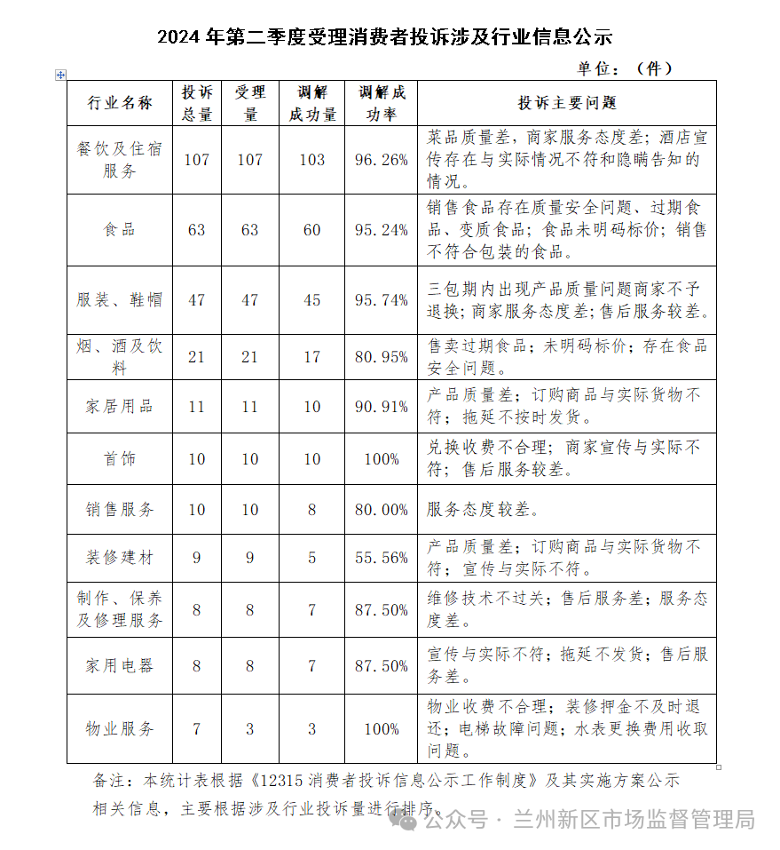 根据《中华人民共和国消费者权益保护法》有关规定及消费者投诉信息公示制度的要求,现将兰州新区市场监督管理系统2024年第二季度涉及投诉比较集中的行业公示如下: