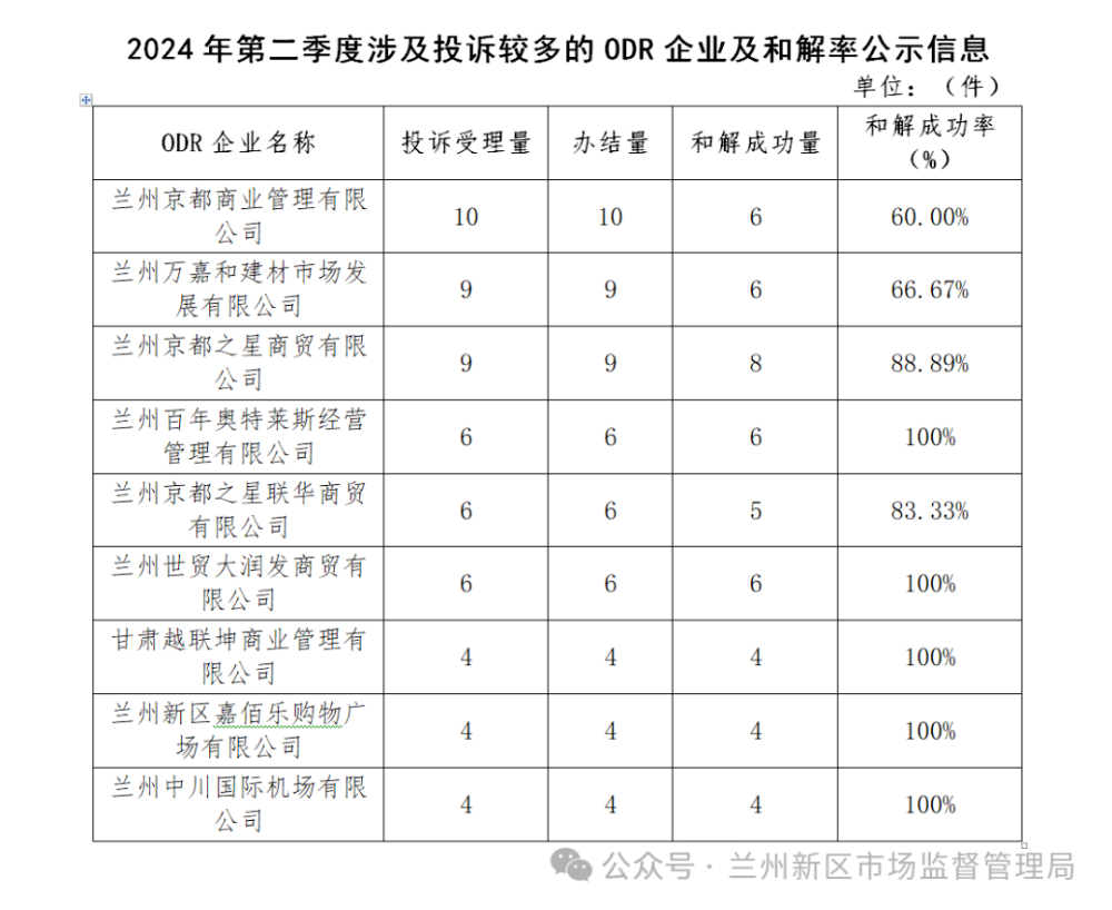 2024年第二季度,兰州新区市场监督管理局通过odr企业处理消费纠纷88件,占投诉总量22.74%。其中,市场监管系统转派odr企业处理79件,消费者自行选择odr企业和解9件。办结上报88件,办结率100%,和解成功76件,和解成功率86.36%,挽回经济损失3.63万元。现将兰州新区市场监督管理系统2024年第二季度涉及投诉较多的odr企业及和解率公示如下: