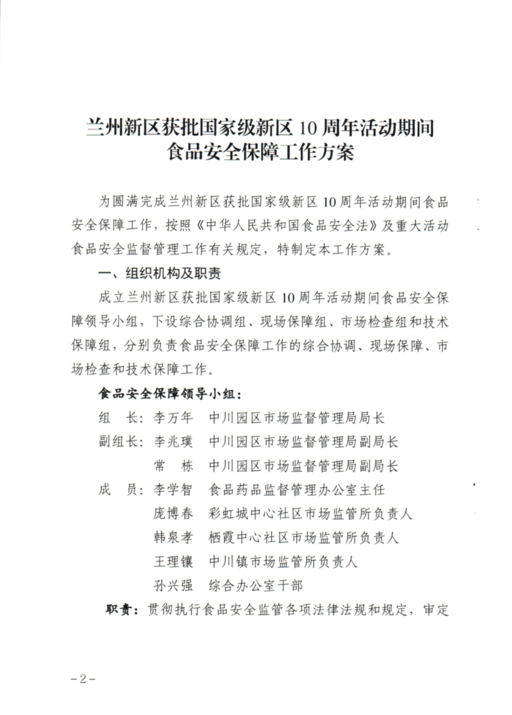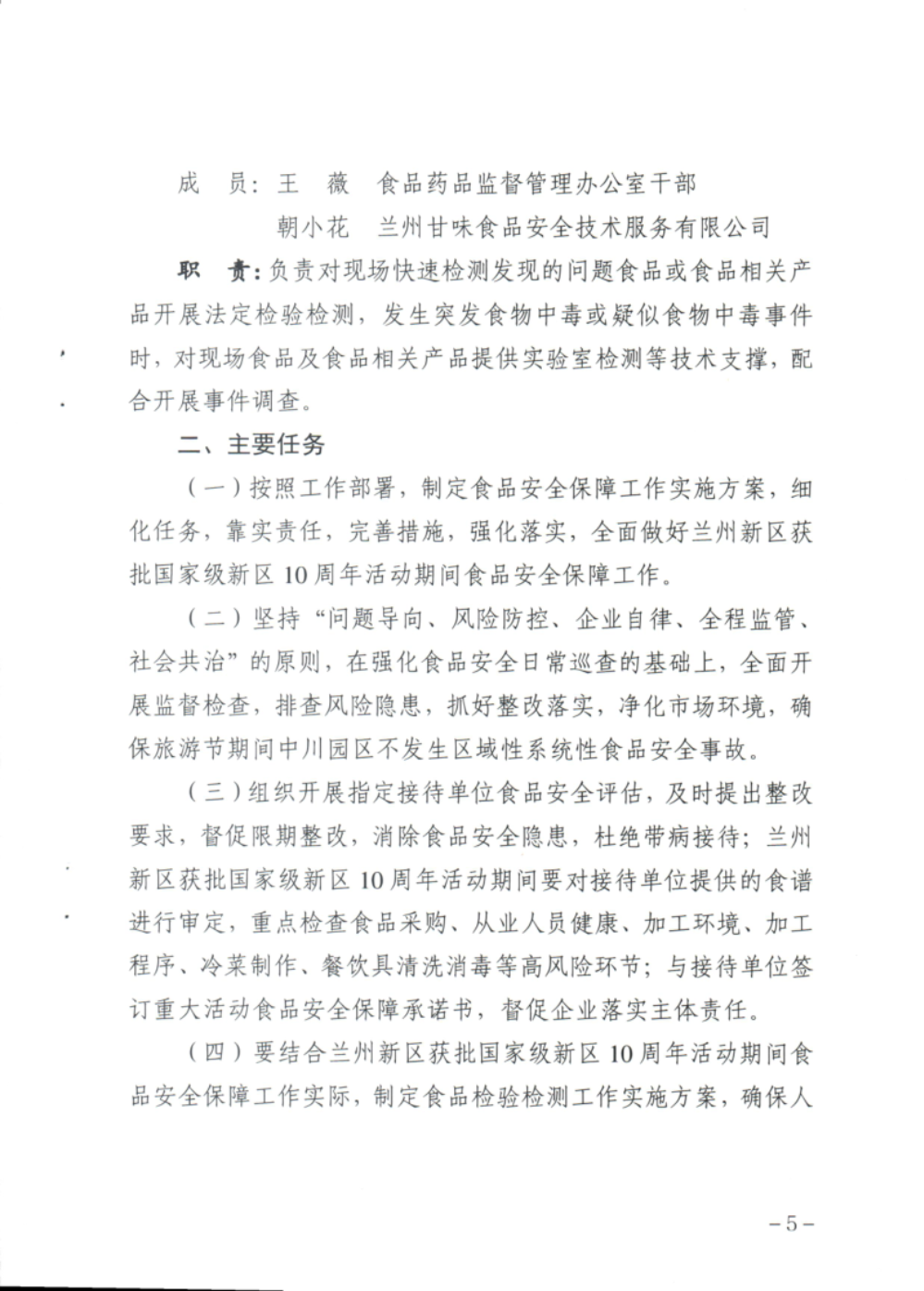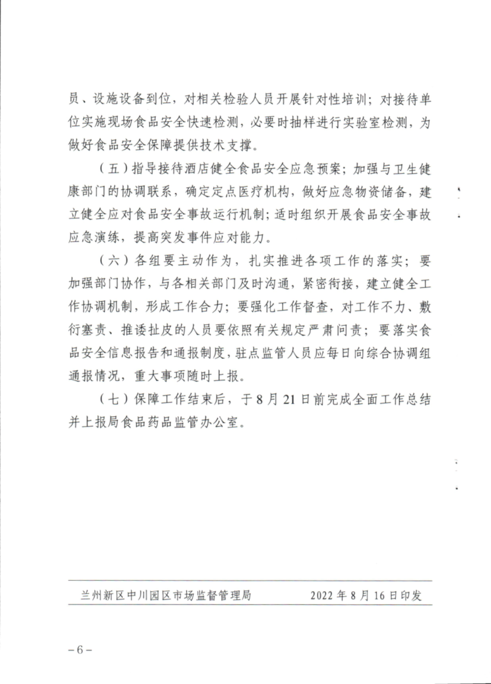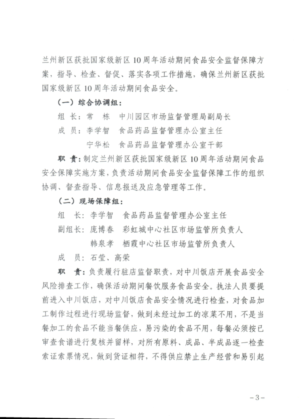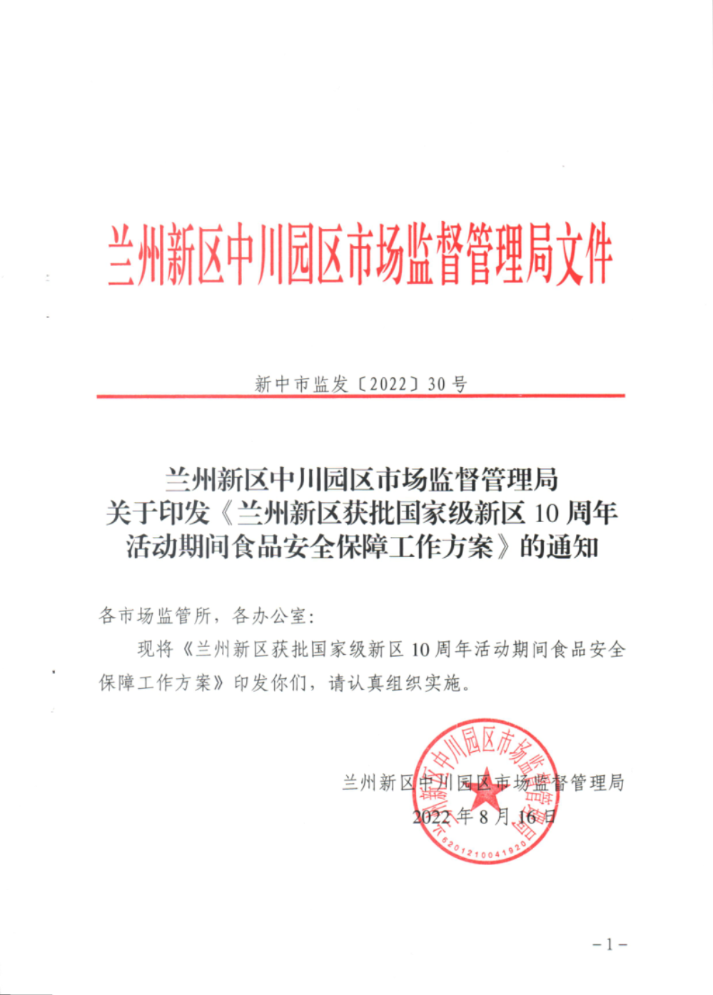 兰州新区中川园区市场监督管理局 关于印发《兰州新区获批国家级新区10周年活动期间 食品安全保障工作方案》的通知-捕鱼网