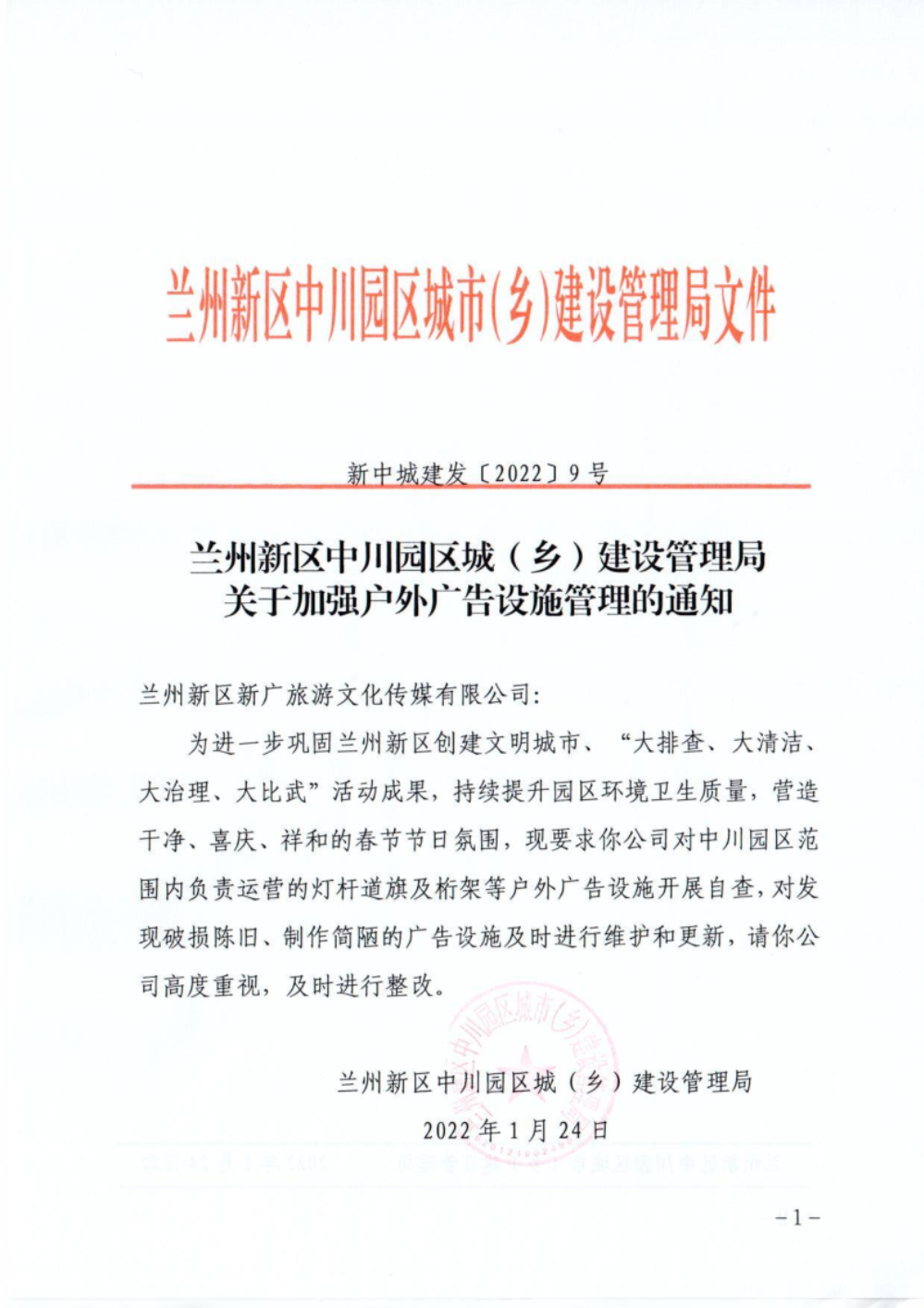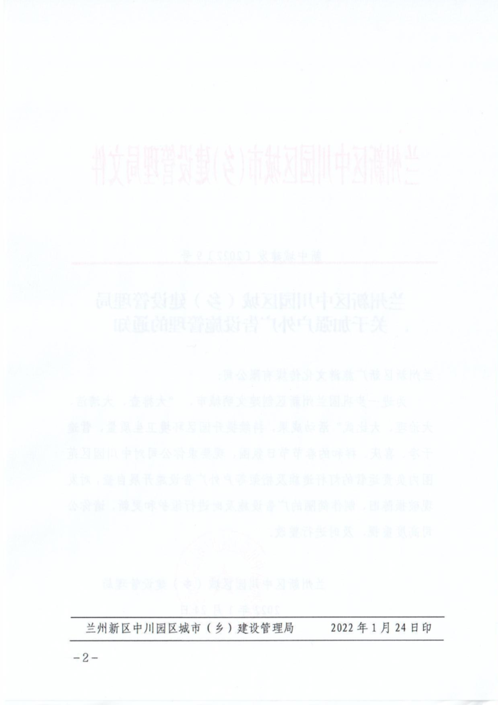 兰州新区中川园区城(乡)建设管理局 关于加强户外广告设施管理的通知-捕鱼网