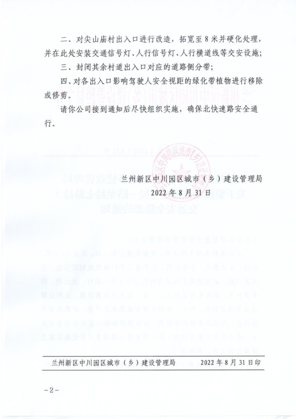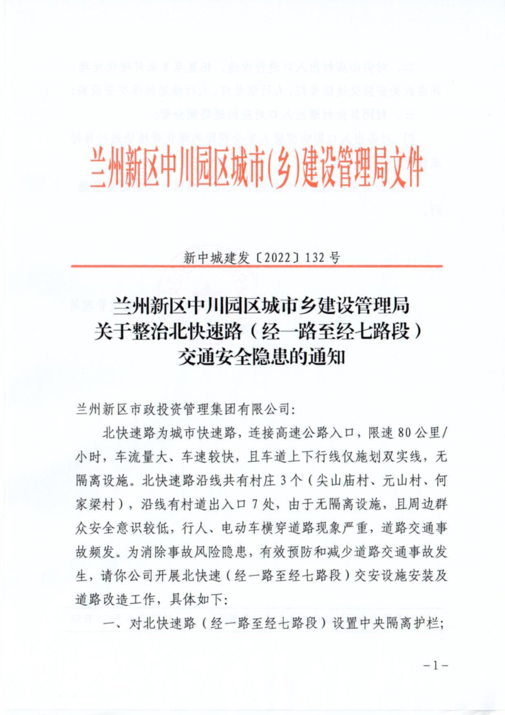 兰州新区中川园区城(乡)建设管理局 关于整治北快速路(经一路至经七路段)交通 安全隐患的通知-捕鱼网