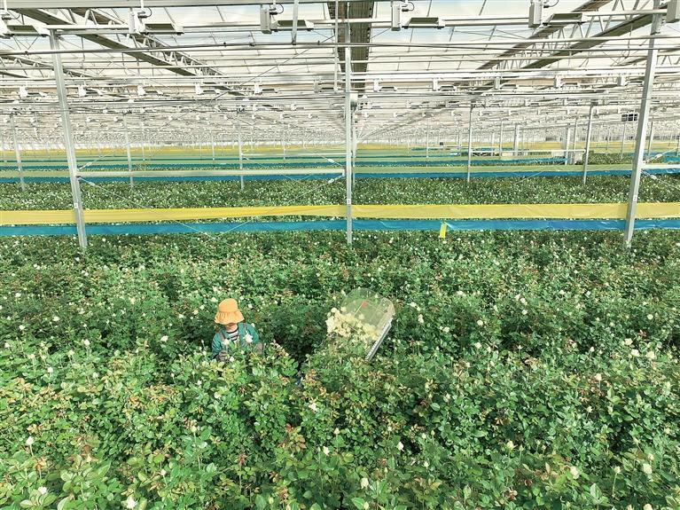 与会代表被新区现代农业示范园温室的鲜花吸引驻足。