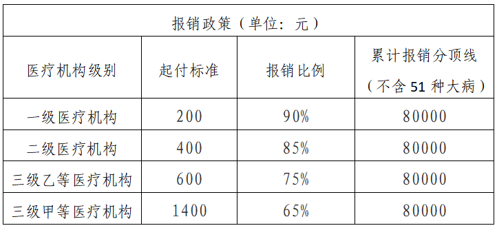 1.普通门诊:起付标准为零起付线,报销比例为70%,每人每年度累计报销不超过130元,可用于门诊购药和门诊相关检查费用的报销。当年累计报销未达到限额的,跨年度不结转。主要就诊范围为:二级公立医疗机构、乡镇卫生院、社区卫生服务中心和符合条件的村卫生所和社区卫生服务站。