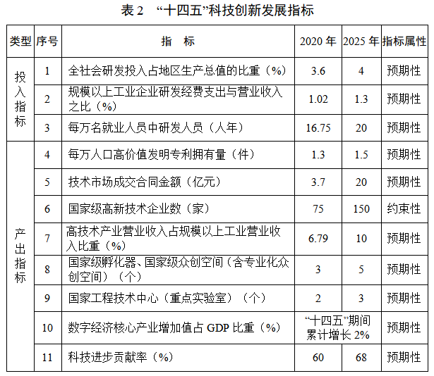 ——科技创新生态更加优化。构建系统创新、协同创新、开放创新的科技创新体系,政策配套更加健全,创新服务便捷普惠,创新效能显著提升,信息经济不断壮大,形成全社会崇尚创新的浓厚氛围。到2025年,技术市场成交合同金额20亿元、科技进步贡献率达到68%;“十四五”期间数字经济核心产业增加值占gdp比重累计增长2%。