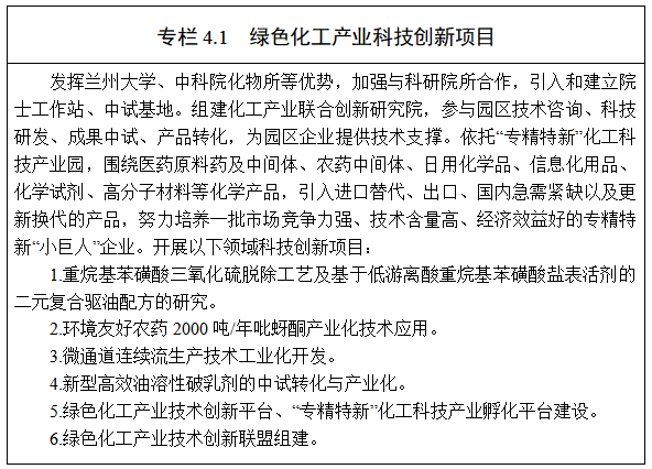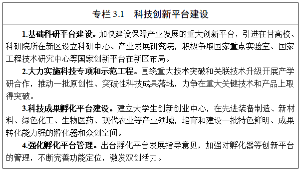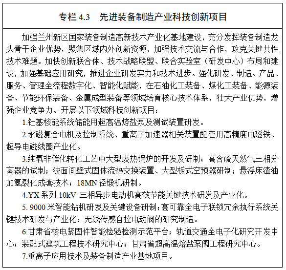 4.拓展创新发展新空间。立足兰州新区在大科学装置、特色产业、科教资源等方面的基础,加快培育以同位素实验室、超高温钍基熔盐泵阀试验平台、硅立方超算中心等为代表的国家战略科技力量,支撑国家重大战略实施、服务国家安全体系建设,努力把兰州新区打造成为兰州国家区域科技创新中心“核心承载区”,夯实兰州新区在全省科技创新体系中的地位。深化产学研合作、产教融合,引进兰州大学、兰州理工大学、甘肃农业大学等高校在新区设立成果转化基地。鼓励企业与院校合作建立校企合作育人新机制,支持学校和企业成立工作室、实验室、创新基地、创客中心、产业学院、实训基地等,建立产教融合人才储备库和校企合作项目库,促进教育链、人才链与产业链、创新链有效衔接。加快推进兰州新区国家装备制造高新技术产业化基地建设,实施一批成长性好、带动力强的装备制造领域科技创新项目,推动能源化工装备、重离子医疗装备、海洋工程装备、节能环保装备科技创新成果转移转化。