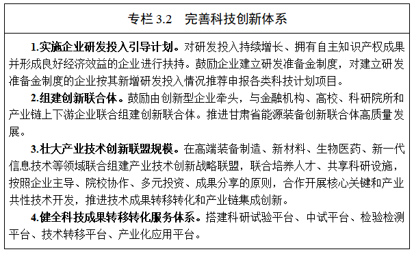 3.完善科技创新体系。构建以产品确定创新的科技供给体系,引导科研机构对接新区企业技术需求布局科研项目,增强企业技术研发、技术应用及技术整合能力,提升企业产品竞争力。健全科技成果转移转化服务体系,完善科技成果评估交易与转化绩效奖励机制。支持行业骨干企业牵头组建体系化、任务型的创新联合体和产业技术创新联盟,集聚行业上下游中小企业创新要素和高校院所科研力量,联合开展重大关键技术、前沿技术研发,促进新技术新产品新工艺产业化、规模化应用,推动产业链供应链创新链升级。支持企业建设院士专家工作站,逐步建立起院士专家与设站企业协作的长效服务机制。实施企业研发平台创新能力提升计划,鼓励建有研发机构的企业主动承担国家、省、市科技专项,与高校院所开展校企合作,联合开展技术研发,突破一批具有自主知识产权的技术和产品。用好甘肃省科学技术奖对企业技术创新的引导激励作用。
