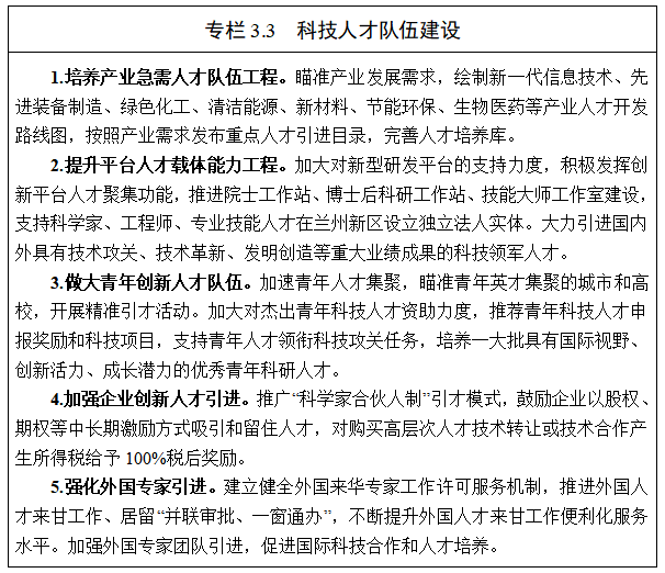 2.引进科技高端人才和科技创新团队。坚持人才是第一资源,全面落实“陇原人才服务卡”制度和新区人才选拔培养扶持政策,积极打造西北地区人才高地。聚焦重点产业、重点行业领域发展需要,通过顾问指导、短期兼职、挂职锻炼、联合攻关、候鸟服务、设立离岸人才创新创业基地等柔性招引模式,加大对高端人才和团队引进,实现分行业、分领域精准引才育才。聚焦融汇优势智力、解决关键难题、转化科研成果,从单一引进高端科研人才向引进科技创新团队转变,形成“引进一个团队、支撑一个项目、做大一个产业”的良好局面。打造优质研发平台吸引人才,统筹推进院士工作站、博士后科研工作站、协同创新基地、海智基地、重点实验室建设。围绕产业发展需要,鼓励省内外高校、科研院所和国有企业科技人才按有关规定在新区兼职兼薪按劳取酬。对高层次和急需紧缺的人才、“特殊人才”,采取“一事一议”方式试行年薪制、协议工资制度,通过签订人才贡献目标责任书、科研项目合同等方式,形成人才工作任务、工作职责、科研成效、经济贡献和人才薪酬相挂钩的制度体系。
