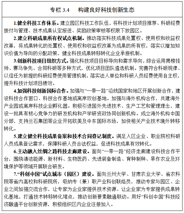 1.深化科技创新体制改革。坚持科技创新与体制机制创新“双轮驱动”,健全科技创新治理体系,促进科技供给侧和需求侧、研发和转化对接。加快管理职能转变,深化“放管服”改革,提升区域创新创业活跃度。推进科技评价制度改革,进一步优化科研项目评审管理机制、改进科技人才评价方式、完善科研机构评估制度。创新科研项目管理方式,试点科技项目常年受理、即时评审制度,推行项目经费“包干制”。完善科技决策和咨询制度,设立以企业家、学术技术带头人为主体的技术创新战略咨询委员会,参与科技创新规划、科技计划项目、科技创新政策的制定。推动在甘高校、科研院所在新区开展赋予科研人员职务科技成果所有权或长期使用权试点,健全企业创新激励和保障机制,将成果转化的处置权、使用权和收益权改革为成果所有权,落实以增加知识价值为导向的分配政策。鼓励支持科研人员兼职创新、在职或离岗创办企业,推动更多创新人才带专利、项目、团队创业。完善“科学家合伙人制”,推广“城市合伙人”“三区联动”“创业会客厅”等做法,畅通科技合作、成果转化渠道。规范科研伦理,加强科研诚信体系建设,推动科研作风学风实质性改观。完善科技成果评价机制,加快构建政府、社会组织、企业、投融资机构等共同参与的多元评价体系。