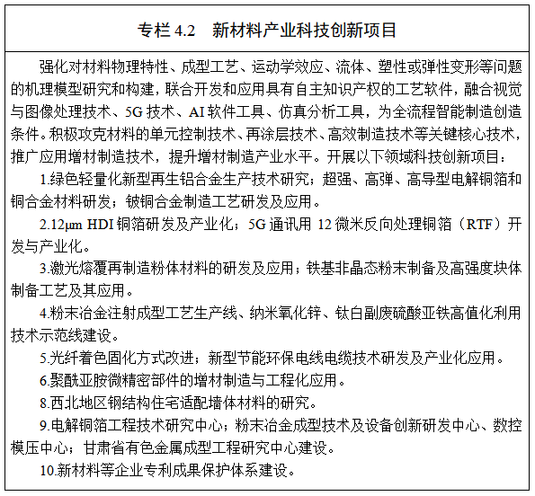 2.科技支撑新材料产业发展。以高铁、新能源汽车发展需求为牵引,研发生产轻量化、高性能、智能型新材料制品。围绕锂电池、高端装备需求,研发超强、高弹、高导型电解铜箔和铜合金材料。围绕新型材料发展,研发碳纤维、粉末冶金、钛及钛深加工、稀土智能化生产技术,做大做强钛及钛深加工产业,培育高附加值、高技术含量稀土功能材料、新能源电池材料、新型保温隔热材料、生物质建筑材料、装饰新材料产品。优化工艺技术、增材制造技术和全流程智能制造技术研究,提高新材料产业技术水平,打造以铝、铜为主的西部合金材料生产应用示范基地和覆盖西北、面向“一带一路”的先进合金材料制造中心。开展材料配方、成型工艺、生产流程控制研究,提高材料的质量稳定性。