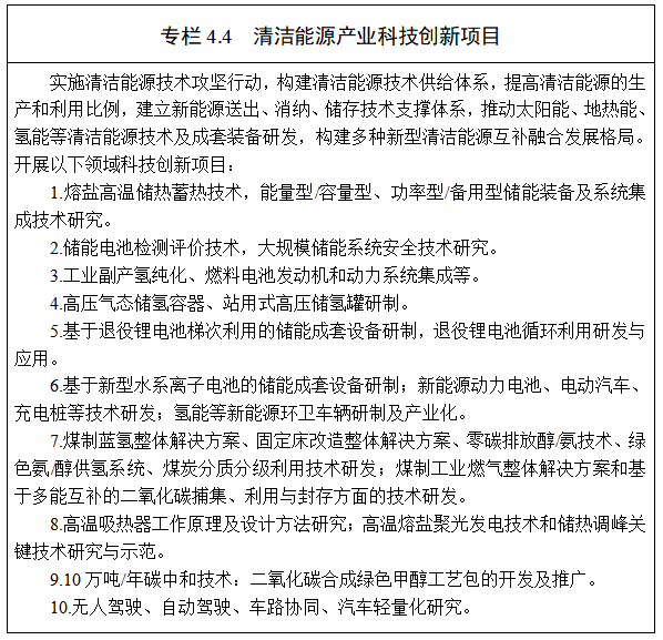 2.科技支撑清洁能源产业发展。围绕“整车—电池电机电控—充换电设备—试验检测”等新能源汽车产业链,加大对动力电池、储能电站、充电设施、氢能储运等技术研发和成果转化的支持力度,开展驱动电机、电控系统、车用附件等核心关键部件研发和技术引进,形成相对完善的新能源汽车产业技术创新链。在氢能产业领域,依托全球首套千吨级太阳燃料合成:二氧化碳加氢合成甲醇工业化示范项目、首航高科能源等企业,开展氢能和氢燃料电池汽车技术研发,推动制氢、储氢、运氢、加氢、用氢方向的发展。发展新能源装备与技术,研发太阳能光伏/光热装备、钍基核能系统储能用超高温熔盐泵、太阳能发电技术及装备、高可靠性全天发电的太阳能热发电系统集成技术及关键设备、高温吸热工质、储能与储热材料及系统、新型反光材料及低成本反射镜等,形成具有特色的产业集群和较为完整的产业链。加快开展中深层地热开采利用、余热回收利用、多能互补清洁取暖技术研发,推动新区能源清洁化发展。在储能产业领域,以电化学储能、氢储能、熔盐储能技术为支撑,开展多种储能技术、成套装备之间的融合及差异化集成开发。