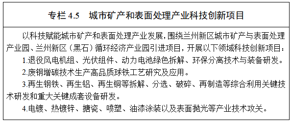 3.科技支撑城市矿产和表面处理产业发展。依托兰州大学、兰州理工大学、中联西北设计院等研究机构技术力量,开展城市矿产与表面处理产业园环境承载能力研究,为园区绿色循环可持续发展提供保障。以技术创新、管理创新为导向,以国际化、市场化、生态化为主要方式,围绕提高再生资源回收、分拣、拆解、环保处理水平等,重点发展火车、汽车、家电、金属制品、电池等产品拆解以及废旧轮毂、玻璃、轮胎再利用技术攻关,支持建设现代化专业分拣中心,城市矿产资源化利用等领域关键技术研发,推广应用新技术、新工艺、新设备,大幅提高废旧商品回收的现代化水平。围绕汽车轮毂、平板玻璃来料加工等产业配套需求,重点开展电镀、热镀锌、搪瓷、喷塑、油漆涂装以及表面抛光等产业技术攻关。