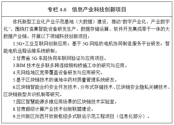 1.科技支撑信息产业发展。加快新型工业化产业示范基地(大数据)和丝绸之路信息港枢纽建设,以“数字产业化、产业数字化”为发展主线,以信息技术与特色优势产业深度融合为方向,积极布局数据信息关联产业,着力打造集数据存储运算、软件开发集成、智能设备研发生产、在线支付等全产业链的一体化国家数据信息产业集聚发展基地。在加快推进数字产业化方面,培育引进人工智能、物联网、工业互联网、软件研发等一批高科技高成长企业,加强科技型企业、中小微企业扶持力度,支持各类创新主体构建关键技术研发和成果转化的创新发展体系。在加快推进产业数字化方面,推动工业互联网、“上云用数赋智”、数字化车间、智能工厂、数字化应用,加快传统产业的数字化转型和产品数字化升级。推动5g的集成应用示范,加快传统产业绿色化、信息化、智能化“三化”转型升级。