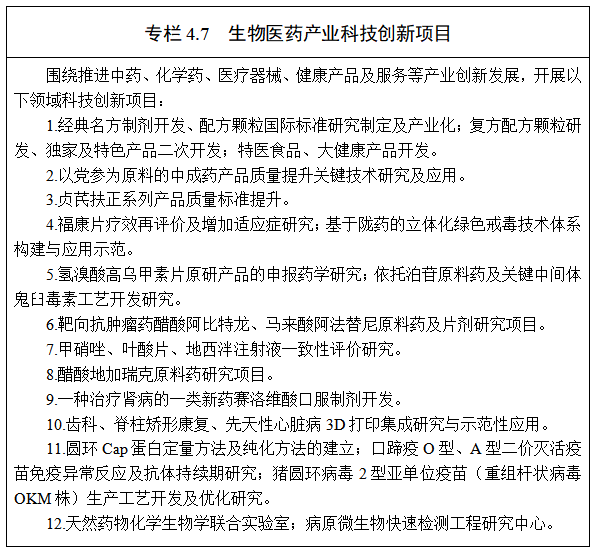2.科技支撑生物医药产业发展。立足新区生物医药产业基础,支持佛慈制药、和盛堂制药等企业开展中药材、中医药研发和产业化,推动中药产业转型升级。坚持原研药和仿制药、高端制剂和高端原料药并行发展,支持兰药药业等企业与高校、科研院所合作开展化学药研发、一致性评价及处方工艺研究,加快建立原研药、仿制药、高端制剂、高端原料药研发体系。推进生物安全三级防护实验室建设。强化疫苗基础性研究,突破疫苗分子设计、多联多价设计、工程细胞构建等关键技术,实现核心技术从“跟跑”到“并跑”到“领跑”转变。依托西部药谷产业园,引育一批龙头企业,建设集现代中药研发生产中心、医学成果转化中心、康复医疗器械生产销售、医药仓储物流为一体的生物医药产业园,打造兰州新区首个“大健康产业 生物医药产业”专业孵化园。
