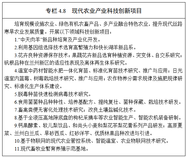 3.科技支撑现代农业产业发展。推进农业科技创新和成果转化,完善设施农业、绿色有机农畜产品等农业新品种新技术引进、农业机械化、农业信息化、农业标准化、农产品质量检验检测、重大动植物疫病害防治等科技支撑体系,提高科技对农业的贡献率。运用科技手段解决“种子”和“种地”两个关键问题,加强与国内知名农业科研院所、高校在种子、种质方面的产学研合作,积极培育育种企业。发展农业智能生产、智能农机装备、设施农业等关键技术和产品。完善农业科技服务体系,加快构建以农技推广机构、高校、科研院所、企业等科技服务力量为依托,多元互补、协同高效的农业科技社会化服务体系,开展农业重大技术集成和示范推广。支持皋兰县优势特色作物与动物良种、农用物资、农业新材料等领域科技创新,持续做优做强高原夏菜、兰州白兰瓜、旱砂西瓜、红砂洋芋、优质林果等特色产业。