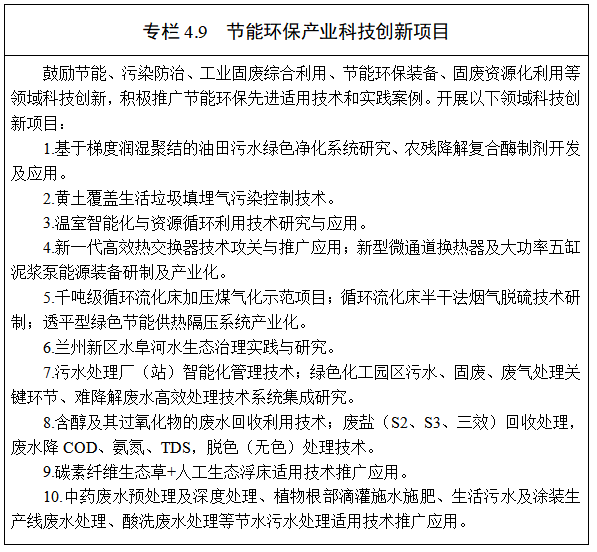 4.科技支撑节能环保产业发展。加强节能环保、污染防治、工业固废综合利用等重点领域关键技术研发,发展高效节能、资源循环利用、大气治理、污水处理等先进技术和专业化服务。支持兰石集团大力发展节能环保装备,建设节能环保装备制造产业基地。培育壮大节能电气设备、环保技术设备、资源综合利用设备、再制造和节水设备研发制造等产业。鼓励新区制造业企业加大节能环保技术和产品研发力度,加强新型节能电机、余热余压综合回收利用、工业过程节能、建筑节能等领域关键技术研发,加快高效蓄热、换热、冷却、干燥技术和装备研发示范。加强与高校科研院所产学研合作,对化工园区污水、固废处理中的关键环节领域进行研究,保障园区高质量快速度发展,为产业集聚发展赋能加力。积极引导省内科研院所、高等院校、污水处理企业等开展污水深度处理、污泥资源化利用共性和关键技术研发,引导企业使用国家鼓励的工业节水工艺、技术和装备,提升水循环利用水平。