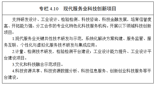 5.科技支撑现代服务业发展。推动生产性服务业向专业化和价值链高端延伸,强化现代服务业关键共性技术突破,支持研发设计、工业设计、检验检测、科技咨询、科技金融发展,促进现代服务业与农业、工业、文化旅游等领域有机融合,实现科技服务精准化。推进创新创业服务体系建设,培育一批信誉度高、开拓能力强、分工合作的专业化、特色化科技服务机构。加强计量、检测技术等基础能力建设,发展面向设计开发、生产制造的分析、测试、检验、标准、认证等服务。加强知识产权服务,大力发展知识产权代理、法律、信息、咨询、培训等机构,提升知识产权评估交易、保护维权、投融资等服务水平。依托绿色金融改革试验区建立科技金融服务体系,开展科技保险、科技担保、知识产权质押等科技金融服务。