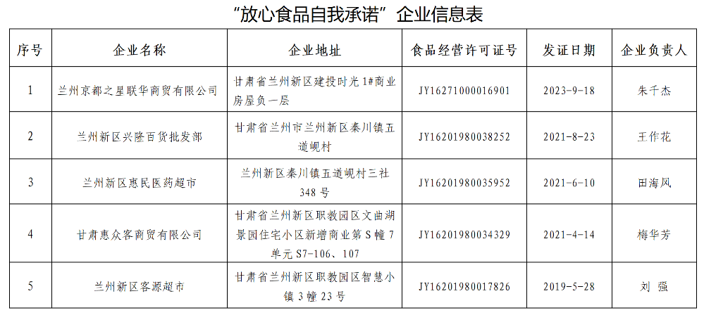 兰州新区市场监督管理局关于对“放心食品超市自我承诺”企业的公示-捕鱼网